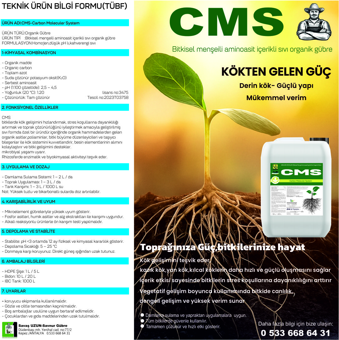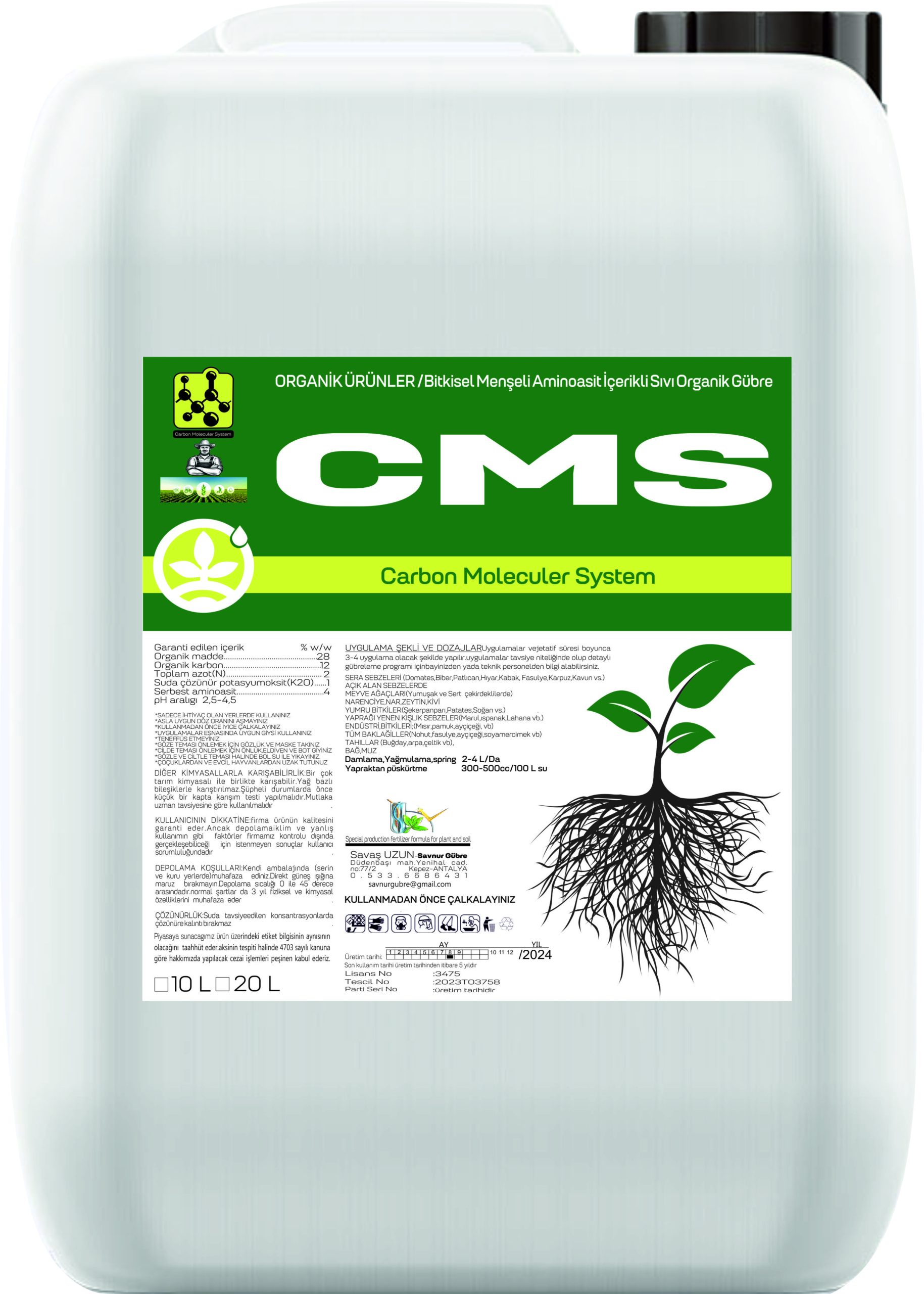 CMS – Carbon Molecular System, bitkisel menşeli aminoasitler içeren sıvı formda bir organik gübredir. Düşük pH’lı, homojen ve kahverengi yapısıyla toprakta çözünürlüğü artırır, bitkilerin kök gelişimini hızlandırır ve stres koşullarına karşı dayanıklılığını güçlendirir. İçeriğinde bulunan organik asitler, poliaminler, bitki büyüme düzenleyicileri ve taşıyıcı bileşenler sayesinde kök sistemini kuvvetlendirir, besin elementlerinin alımını kolaylaştırır ve genel bitki gelişimini destekler. Ayrıca rhizosfer bölgesinde mikrobiyal yaşamı uyararak enzimatik ve biyokimyasal aktiviteyi teşvik eder. Damlama sulama sisteminde 1–2 L/da, toprak uygulamalarında 1–3 L/da, tank karışımlarında ise 1–3 L/1000 L su dozlarında kullanılması önerilir. Mikroelement gübreleri, fosfor asitleri, humik asitler ve alg ekstraktlarıyla yüksek uyumluluk gösterir. 5–25 °C arasında, doğrudan güneş ışığından uzakta muhafaza edilmelidir. pH <3 ortamda 12 aya kadar fiziksel ve kimyasal kararlılığını korur. Ürün HDPE şişe (1L/5L), bidon (10L/20L) veya IBC tank (1000L) ambalajlarında sunulmaktadır. Koruyucu ekipmanla kullanılmalı, göz ve cilt temasından kaçınılmalı, boş ambalajlar uygun şekilde bertaraf edilmelidir.